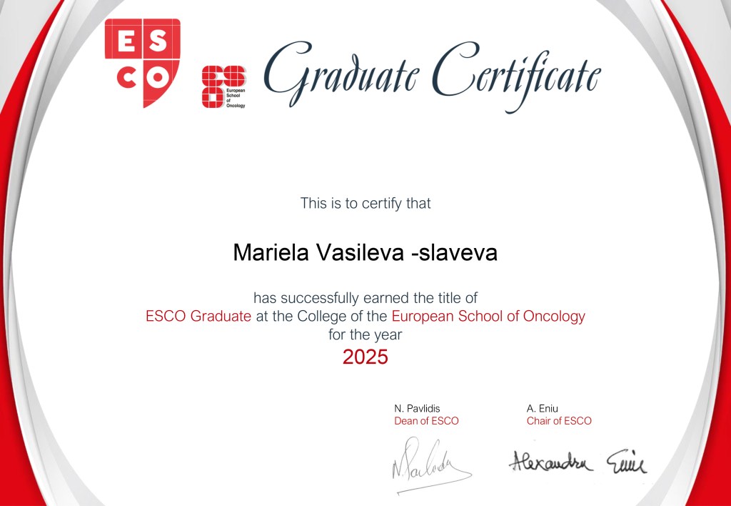 Сертификат за завършване на колежа на Европейското училище по онкология