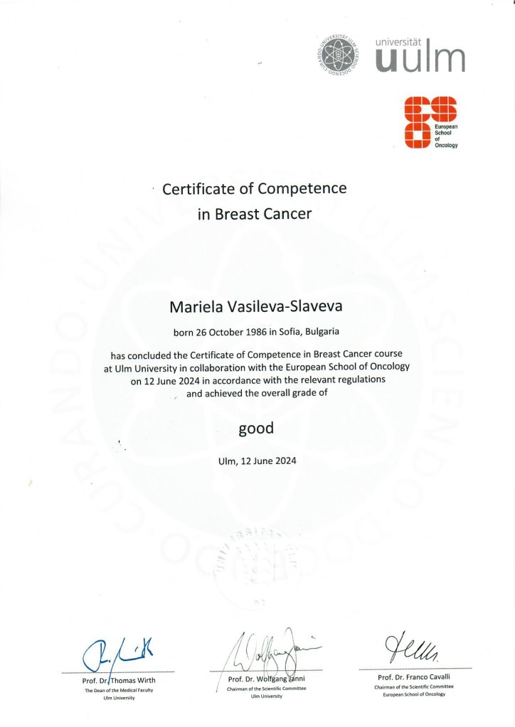 Сертификат за компентност за рака на гърдата на Европейското училище по онкология
